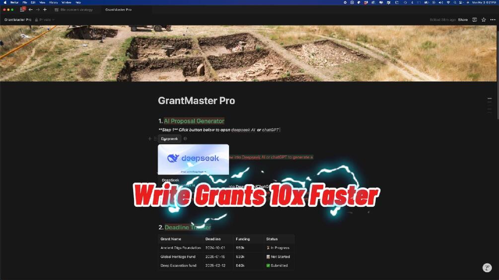 Stop wasting weeks on grant proposals. This done-for-you Notion template automates 80% of your work with AI prompts, deadlines trackers, and pre-written scripts—tailored for archaeologists.